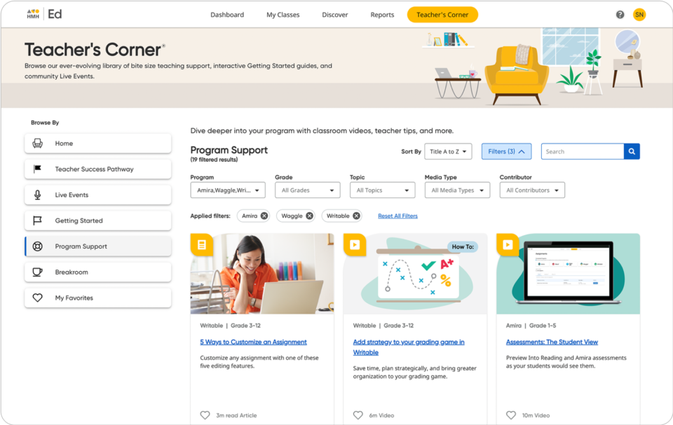 Teacher’s Corner on Ed offers yearlong access to professional learning, with live events and on-demand content that support teachers in implementing programs, organizing classrooms, and learning best practices.